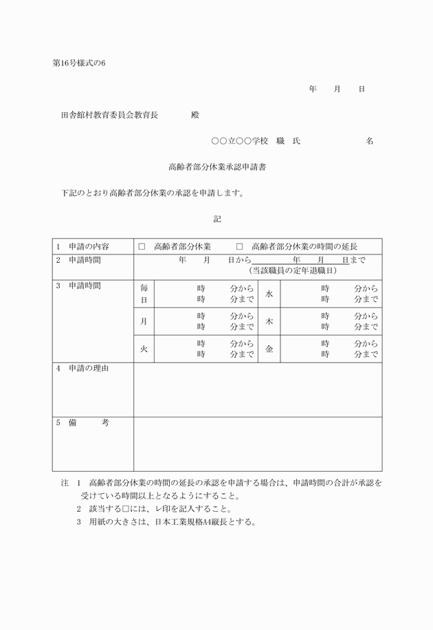 第14条の3 職員は、地方公務員法第26条の3第1項の規定による高齢者部分休業の承認を受けようとするときは、高齢者部分休業承認申請書(第16号様式の6)により行うものとする。