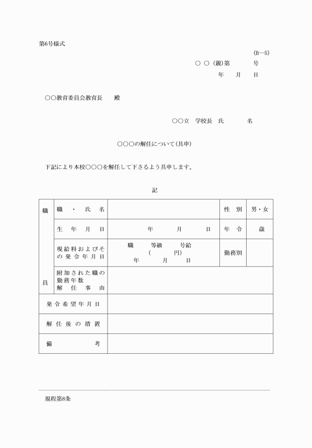 第2条 職員として採用された者又は転任の発令を受けた者は、発令日(発令日以降に辞令を受けたときは、その日)から7日以内に赴任しなければならない。もし7日以内に赴任できないときは、その事由を具し、新任校の校長を経て、教育長に赴任延期届(第1号様式)を提出しなければならない。